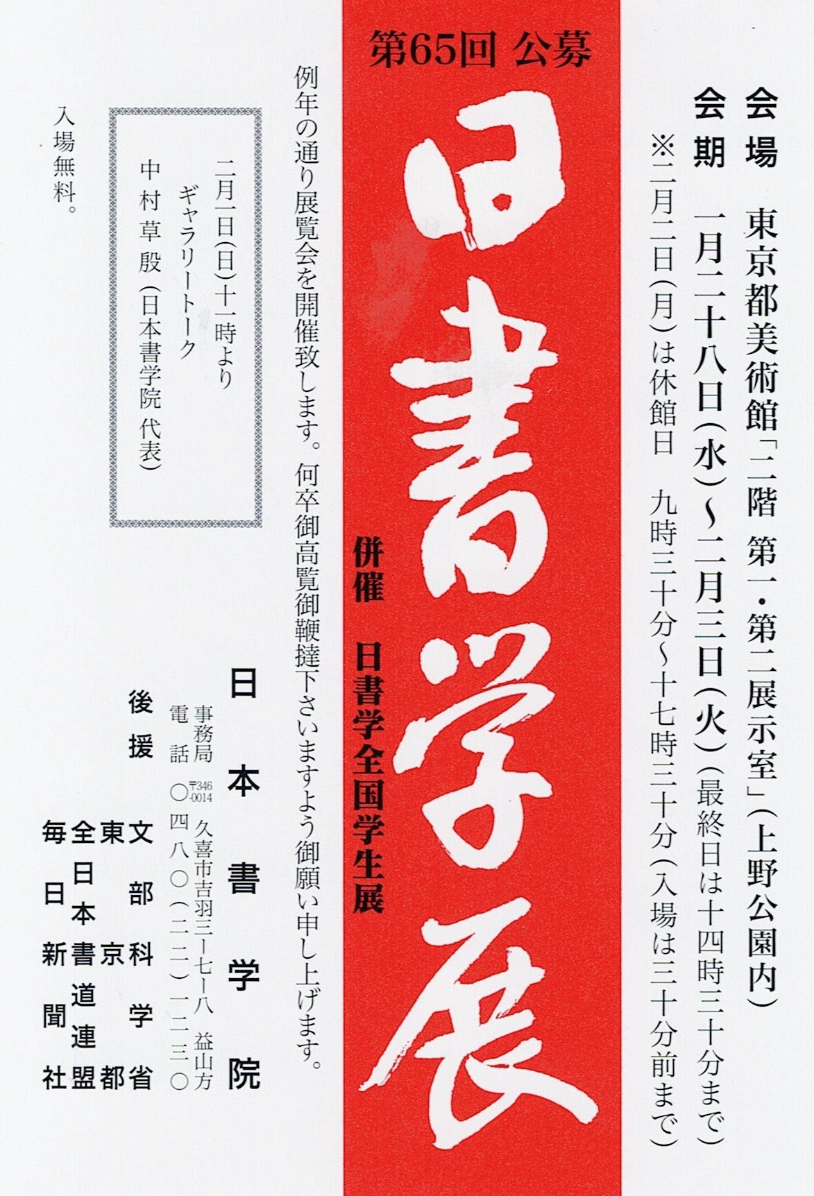 日本書学院のホームページへようこそ。 昭和36年に創設した書道団体です。『正統なる書の美を追求する。』を基本テーゼとし毎年1月に東京都美術館で公募展を、5月に同人展等を開催しています。